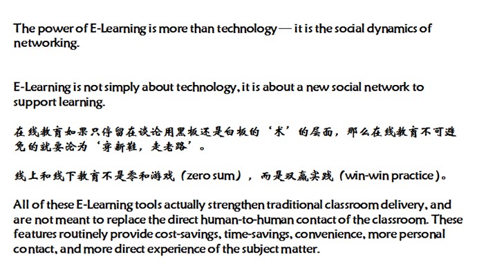 圖7的兩個觀點我非常認(rèn)同,“The power of E-learning is more than technology—it is the social dynamics of networking. E-learning is not simply about technology. It is a new social network to support learning.我不認(rèn)同動不動就談“顛覆”,我們都知道,制造恐慌是最好的營銷。作為在線教育的從業(yè)者,去炒一些概念是可以的。但當(dāng)我們?nèi)プ鲆粋€產(chǎn)品的時候,我希望我們所有的朋友能夠靜下心來,找到教育的根源,做好我們的產(chǎn)品,使之經(jīng)受得住市場的考驗,形成一個扎實的產(chǎn)品線。