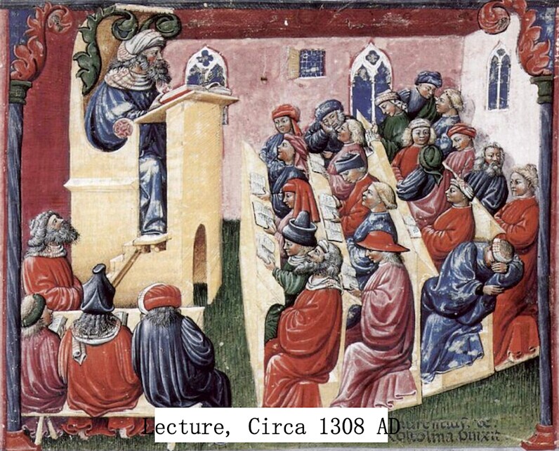 下面這張圖是Lecture,意大利的一所大學(xué),公元前1088年建立的,它并沒(méi)有很多的變化,這個(gè)講座是700年前講座的場(chǎng)景,大家看有什么變化嗎?我站在講臺(tái)上,你們?cè)谂_(tái)下,這種講課的模式700年來(lái)都沒(méi)有巨大的變化。