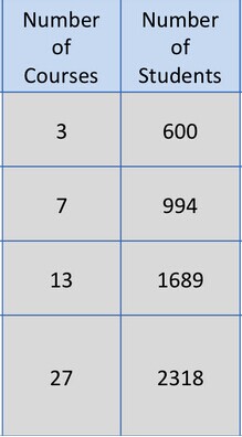 我覺(jué)得很驚奇的是,新技術(shù)采納的速度在校園是非常之快的。上圖右側(cè)數(shù)字是2014年春天的時(shí)候,左側(cè)數(shù)字是2013年,前面一列是課程的數(shù)量,后面一列是學(xué)生的數(shù)量,它成長(zhǎng)是非常快的。