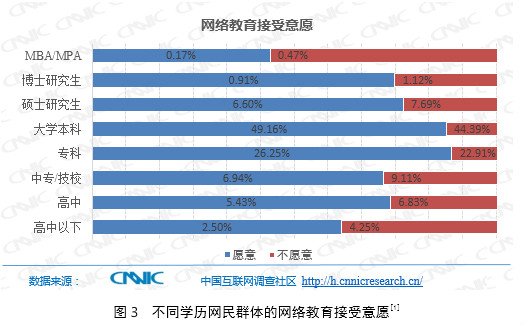 圖3顯示,高學(xué)歷者接受網(wǎng)絡(luò)教育的意愿很低。MBAMPA、博士研究生愿意接受網(wǎng)絡(luò)教育的人群占比不足1%;碩士研究生中,不愿意接受網(wǎng)絡(luò)教育的人群占比較高。學(xué)歷飽和、時(shí)間少、課業(yè)負(fù)擔(dān)重等因素降低高學(xué)歷群體的再教育需求。另一方面,高中及高中以下網(wǎng)民中不愿意接受網(wǎng)絡(luò)教育的占比較高,這一群體承擔(dān)著在讀課業(yè)、輔導(dǎo)班、特長(zhǎng)班及其他壓力。