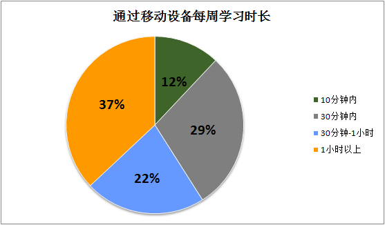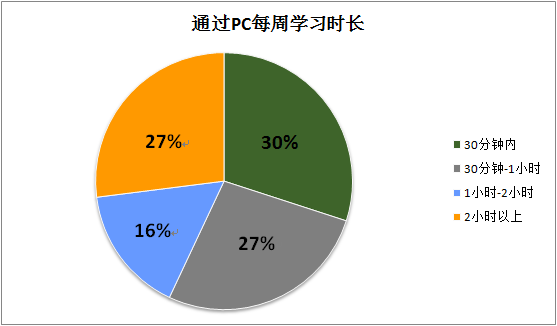 報(bào)告顯示,6成用戶每周在線學(xué)習(xí)時(shí)間不足1小時(shí)。在PC端,30%的用戶每周在線學(xué)習(xí)時(shí)長在半小時(shí)以內(nèi),27%的用戶周在線學(xué)習(xí)時(shí)長超過2小時(shí),在線學(xué)習(xí)時(shí)長呈現(xiàn)“兩極化”;在移動(dòng)端,41%的用戶每周在線學(xué)習(xí)時(shí)長不到半小時(shí),12%的用戶每周少于10分鐘,22%的用戶每周學(xué)習(xí)半小時(shí)-1小時(shí),37%的用戶每周學(xué)習(xí)時(shí)長超1個(gè)小時(shí)。