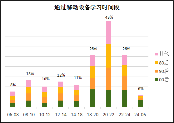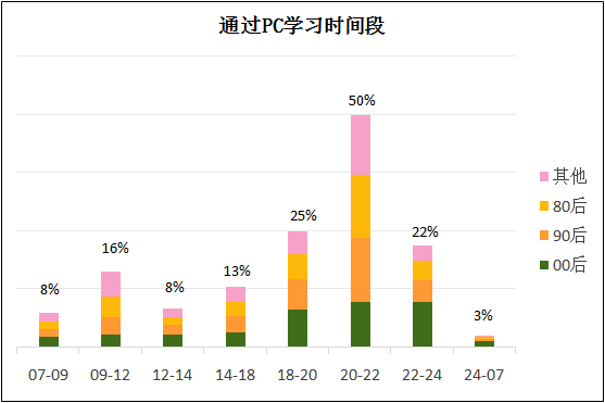 盡管在線學(xué)習(xí)可以滿足用戶隨時(shí)隨地學(xué)習(xí)的需求,但報(bào)告數(shù)據(jù)顯示:用戶學(xué)習(xí)時(shí)間的“集中化”趨勢(shì)明顯,每天的18:00-24:00是用戶集中學(xué)習(xí)的時(shí)間。其中,20:00-22:00是用戶學(xué)習(xí)最為集中的時(shí)間,綜合多個(gè)年齡段來看,這一時(shí)間段的“集中化”分布情況分別是PC的端占比達(dá)到50%和移動(dòng)端的占比達(dá)到43%。