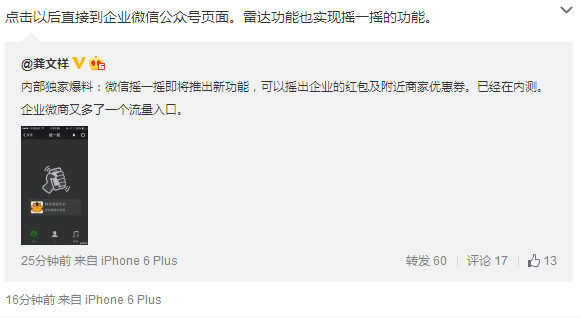 多知網(wǎng)1月5日消息,今天認(rèn)證為“深圳觸電電子商務(wù)有限公司創(chuàng)始人龔文祥”在微博爆料:微信搖一搖即將推出新功能,可以搖出企業(yè)的紅包及附近商家優(yōu)惠券,已經(jīng)在內(nèi)測。