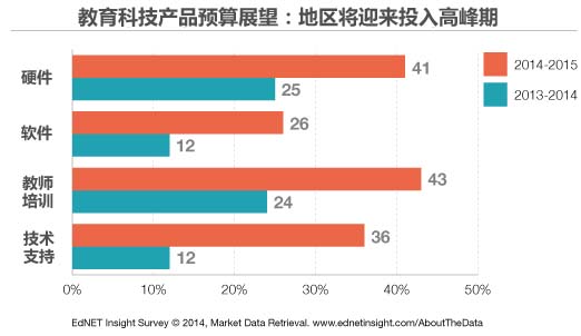 EdNET Insight主管凱瑟琳·布蘭特里表示:“相比過去幾年學(xué)校對(duì)他們的教育科技預(yù)算更為樂觀。”近90%的學(xué)區(qū)預(yù)計(jì),2014-2015學(xué)年在硬件、軟件、教師培訓(xùn)和技術(shù)支持方面的科技預(yù)算將持平或增長(zhǎng)。他們最關(guān)心的是硬件/設(shè)備采購(gòu)和基礎(chǔ)設(shè)施性能;因此帶寬和無線網(wǎng)絡(luò)將影響今后的采購(gòu)決定。