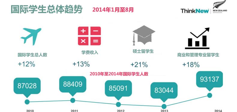 據(jù)《新西蘭國(guó)際教育簡(jiǎn)報(bào)》(International Education Snapshot)披露,2014年1月至8月,到新西蘭留學(xué)的國(guó)際學(xué)生相比去年同期增加10,100名。