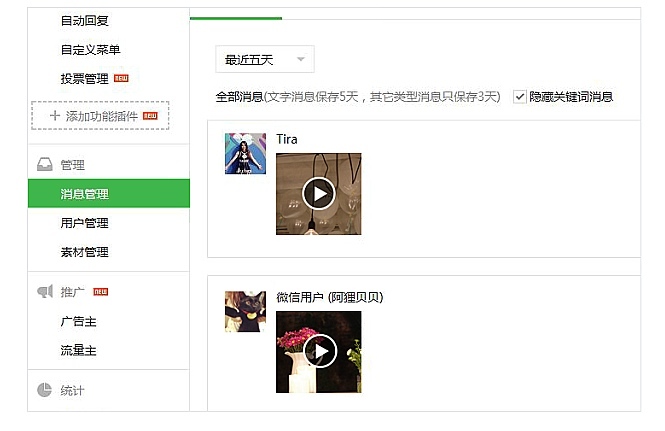 目前,此項(xiàng)功能僅限于認(rèn)證過的微信公眾號(hào)。微信公眾號(hào)可以接受來自微信用戶的小視頻,保存到素材庫里。之后,公眾號(hào)可以將小視頻插入圖文消息中,并下發(fā)給微信用戶。下發(fā)渠道包括群發(fā)消息、自定義回復(fù)、自動(dòng)回復(fù)等。