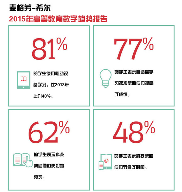 在可用的不同類型學(xué)習(xí)技術(shù)上,學(xué)生發(fā)現(xiàn)自適應(yīng)學(xué)習(xí)是最有效的,85%使用了學(xué)習(xí)技術(shù)的學(xué)生表示學(xué)習(xí)成績提高一些或提高很多。麥克勞-希爾教育出版公司高等教育部門營銷副總裁沙龍·勒布表示:“通過移動設(shè)備學(xué)習(xí)的增長不只是因為智能手機和平板電腦在校園的普及,而是移動設(shè)備現(xiàn)在適合學(xué)生的學(xué)習(xí)。我們從學(xué)生和教師那里獲得的反饋信息顯示,現(xiàn)在的學(xué)生喜歡在任何地方短時間、集中精力即興學(xué)習(xí),而不是在圖書館呆幾個小時。”