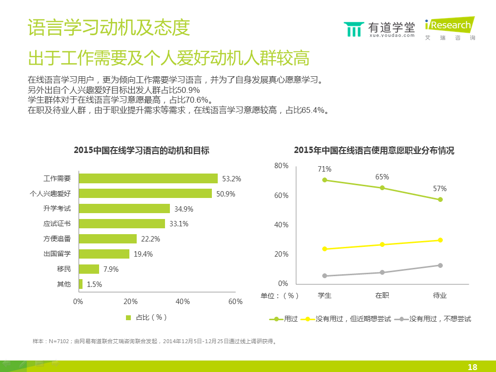 今日,網(wǎng)易有道學(xué)堂與艾瑞咨詢聯(lián)合發(fā)布了一份在線教育語言培訓(xùn)報告,涵蓋了行業(yè)發(fā)展?fàn)顩r、用戶行為觀察、產(chǎn)品分析、未來發(fā)展趨勢等方面。以下為報告部分內(nèi)容: