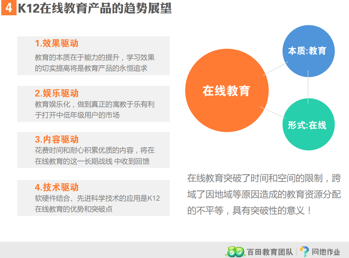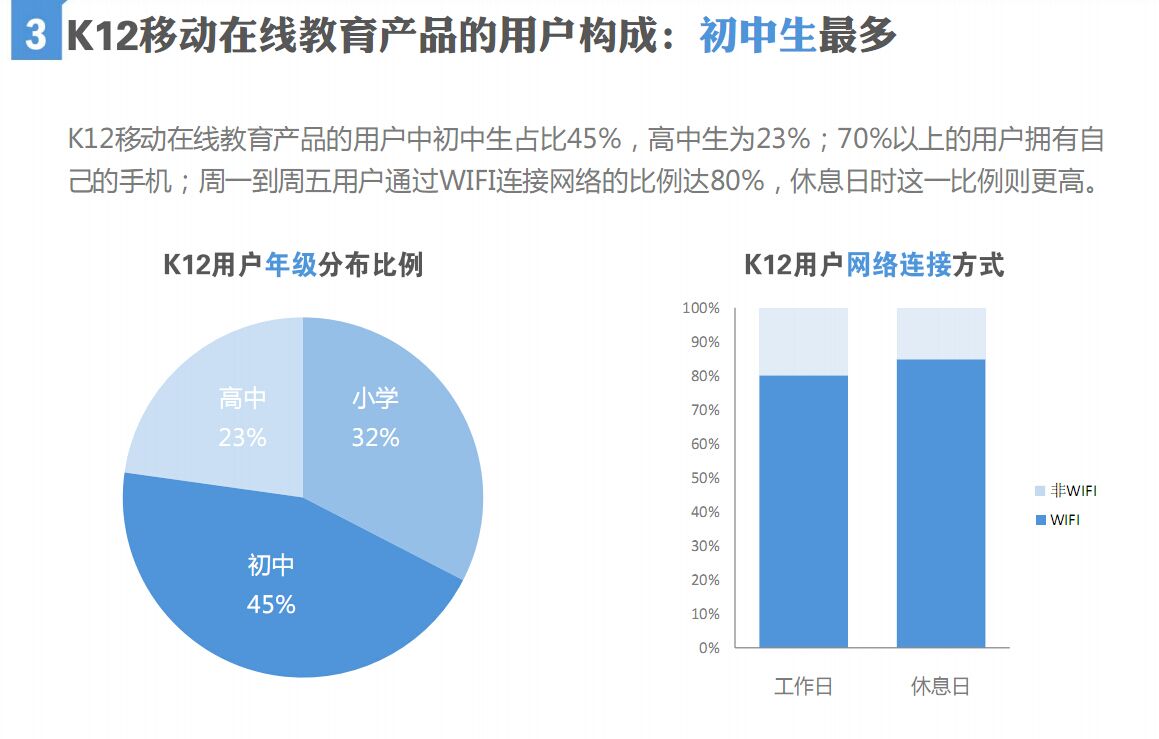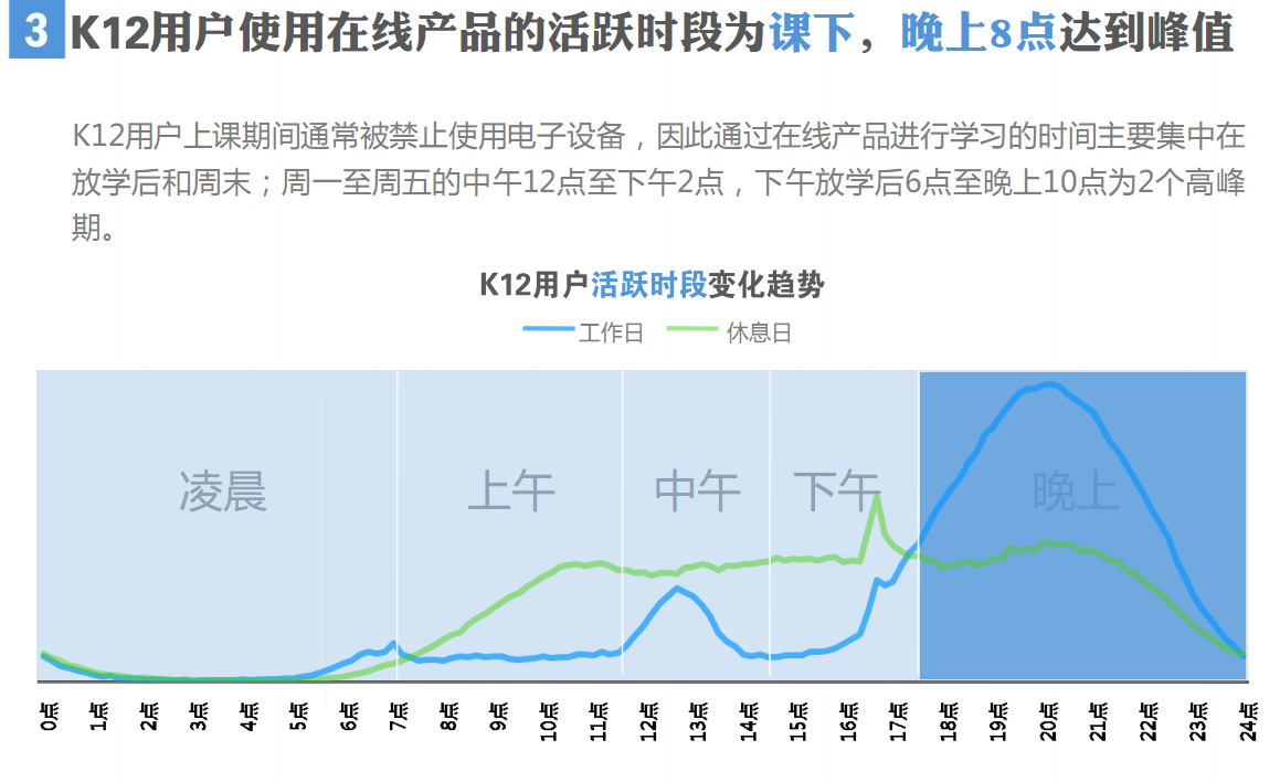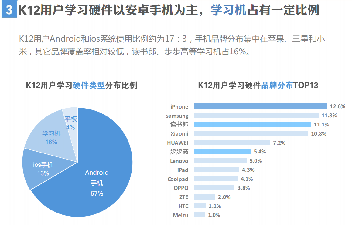 多知網(wǎng)3月24日消息,百田教育今日發(fā)布K12在線教育行業(yè)研究報告。報告顯示,K12移動在線教育產(chǎn)品的用戶中,初中生最多;用戶活躍時段在晚上八點達到最高峰值;K12用戶學習硬件以安卓智能手機為主,其中學習機占有一定比例。