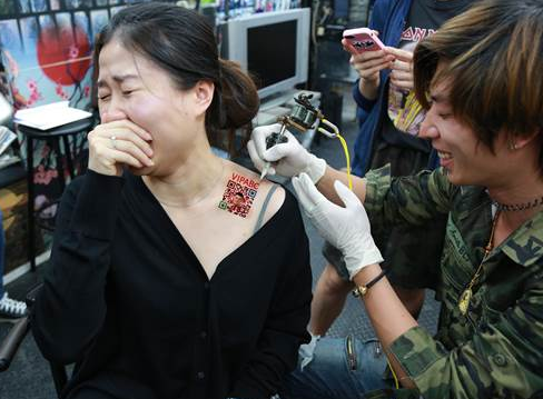VIPABC宣布,即日起只要員工將公司二維碼紋上身,無論紋在任何部位,都將終身聘用、永不辭退,并且保證隨物價(jià)波動(dòng)每年還可加薪3%至5%。這一終身聘用條例將適用于所有員工。員工獲知后,驚喜萬分,更有員工立刻前往紋身。