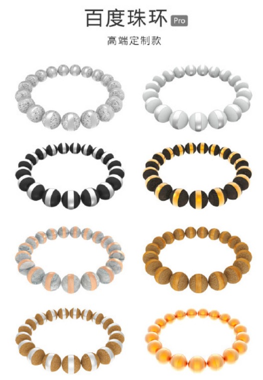 百度珠環(huán),不同于大家熟知的腕帶型可穿戴產(chǎn)品。百度珠環(huán)從外觀上借鑒了中國傳統(tǒng)手串的形式,改為當(dāng)代流行的材質(zhì)與配色。百度珠環(huán)可以自由拆卸組合每一顆珠子,不同的珠子搭載不同的功能模塊,如:健康監(jiān)測、運(yùn)動(dòng)軌跡監(jiān)測、美顏拍照、實(shí)時(shí)搜索與翻譯、家居智控、情侶互動(dòng)、全息投影等新奇功能。力求打造一款時(shí)尚外觀與東方氣質(zhì)完美融合的全球首款模塊化可穿戴設(shè)備。