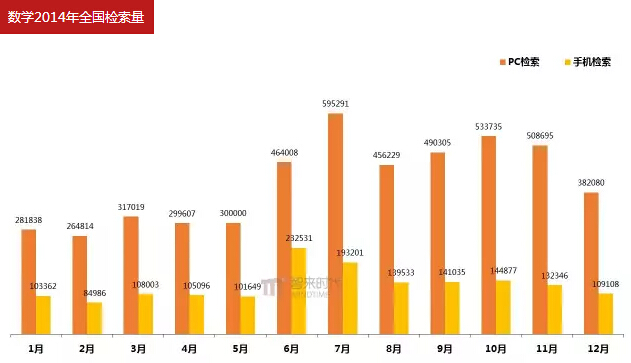 數(shù)學(xué)在三大主科中,近兩年一直是pc端檢索量第一,全年檢索量與學(xué)科橫向?qū)Ρ?,消費者對K12階段數(shù)學(xué)培訓(xùn)產(chǎn)品的需求持續(xù)最大。數(shù)學(xué)長期是不少學(xué)生頭疼的學(xué)科,也是經(jīng)過培訓(xùn)提分較明顯的學(xué)科。2014年全年數(shù)學(xué)的檢索量都較高,尤其自暑假前夕的6月起,數(shù)學(xué)的檢索量一直保持在較高水平,7月達到全年檢索量頂峰,十分堅挺,且全年關(guān)注幅度來看,數(shù)學(xué)學(xué)科檢索量月份之間的懸殊并不大。數(shù)學(xué)產(chǎn)品的檢索量在pc端和手機端差距較懸殊,pc端是明顯主力。
