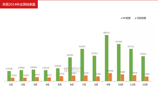 三大主科中的英語,在小學(xué)階段的受重視程度不及語文和數(shù)學(xué),但是在2014年pc檢索量略超語文排在第二。近些年部分地區(qū)的中高考改革中,分值有所下降。英語在三大主科中的檢索量也相對較少。2014年,英語產(chǎn)品的全年檢索量整體幅度基本按月份呈現(xiàn)遞增關(guān)系。與語文和數(shù)學(xué)檢索量的最大值出現(xiàn)在暑假不同,英語的檢索量最大值出現(xiàn)在秋季學(xué)期的9月份,此時正值學(xué)生入學(xué)。秋季學(xué)期是英語檢索量的第一個黃金期,而一年內(nèi)的第二個黃金期則出現(xiàn)在暑假。PC端仍然是絕對優(yōu)先搜索渠道。