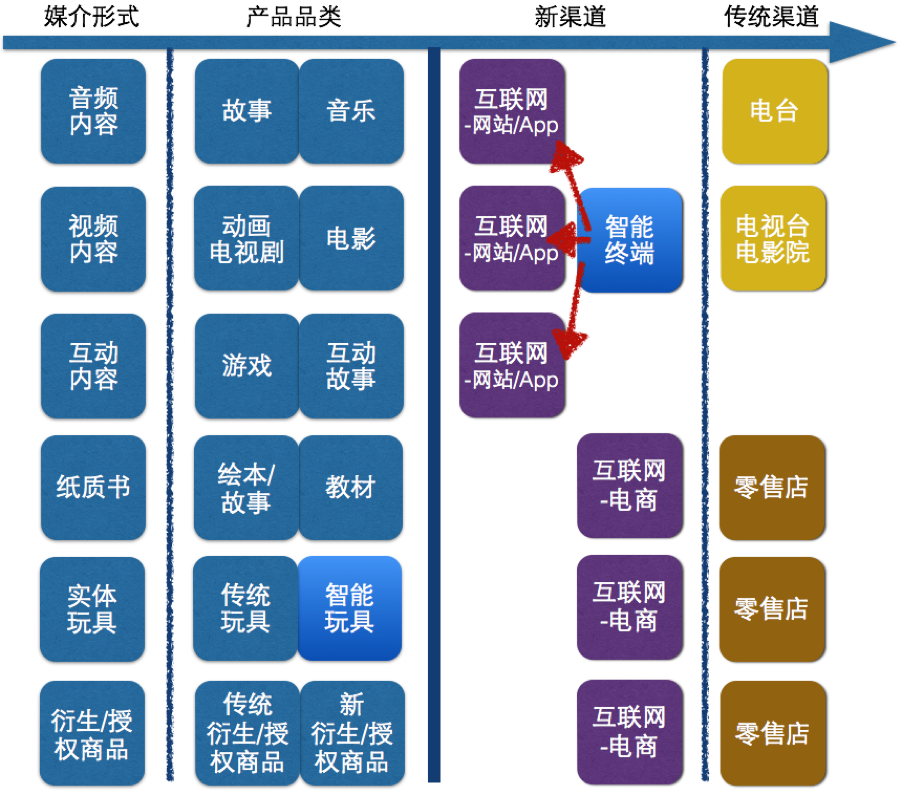 內(nèi)容產(chǎn)品的價(jià)值增值是從模型左上角的內(nèi)容源開始,向下、向右,每跨越一個(gè)維度,都會(huì)增加價(jià)值。從未來(lái)的趨勢(shì)看,不管我們?cè)覆辉敢?,?nèi)容都在向富媒體化、互動(dòng)化、智能化發(fā)展,即向下、向右的內(nèi)容產(chǎn)品形態(tài)。誰(shuí)能把握住未來(lái)的趨勢(shì),誰(shuí)有可能在中國(guó)的兒童市場(chǎng)生態(tài)里占有一席之地,成為能“寫上名字”的公司。