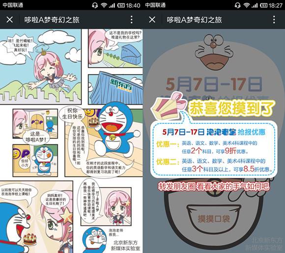 近日,北京新東方新媒體實(shí)驗(yàn)室發(fā)布了第一個(gè)以哆啦A夢(mèng)為主題的H5頁(yè)面,以漫畫的形式展開,記憶面包、任意門等哆啦A夢(mèng)道具均有出現(xiàn)。最后一頁(yè)揭示主題,出現(xiàn)多啦A夢(mèng)形象,點(diǎn)擊哆啦A夢(mèng)口袋出現(xiàn)優(yōu)惠方式,某兩個(gè)或三個(gè)科目同時(shí)報(bào),有相應(yīng)的折扣優(yōu)惠。與輔導(dǎo)類課程不同的是,泡泡少兒是采用了老生優(yōu)惠的方式,意在鼓勵(lì)老生續(xù)報(bào)。