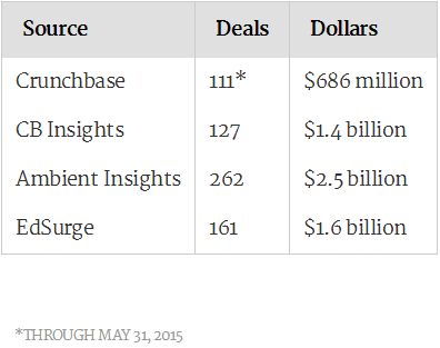 雖然如此,對在一些本是簡單事實上出現(xiàn)分歧的情況,EdSurge還是感到驚訝。6月TechCrunch曾斷言,“投資者似乎在2015年減少了對教育行業(yè)的投資”。1個月后CB Insights稱,2015年第二季度“教育科技融資達到新高”,為7.65億美元,暗示該行業(yè)的融資今年將創(chuàng)新記錄。Ambient Insight也不甘落后,計算出今年上半年教育科技投資超過25億美元。這個數(shù)字超過了Ambient統(tǒng)計的2014全年總額。