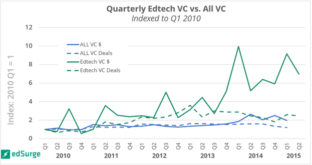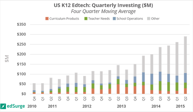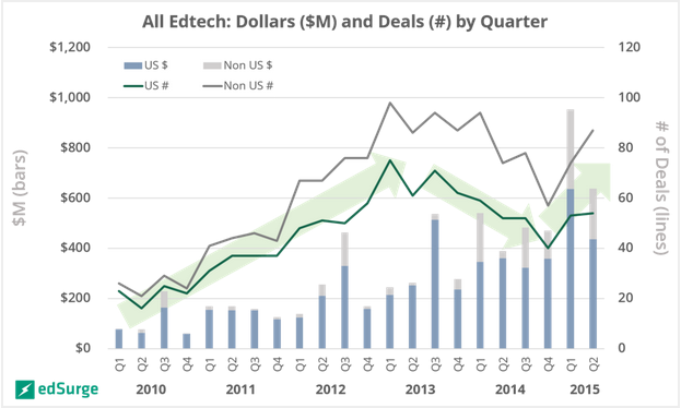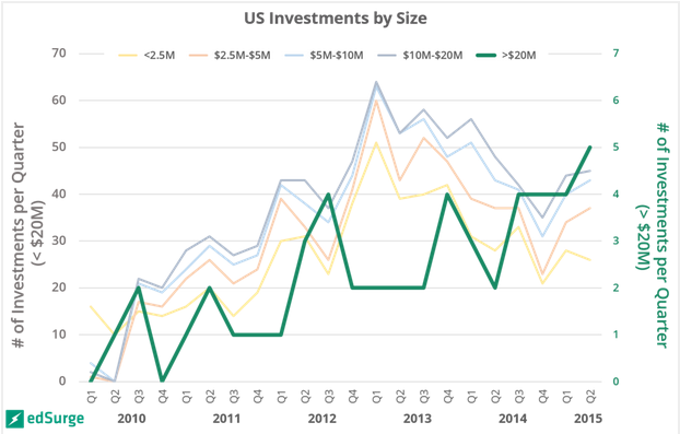 EdSurge對“教育科技投資”的定義包括了所有主要經(jīng)營目標是提高所有學習者(無論年齡多大)的學習成果的科技公司。EdSurge同意Ambient Insight的社交金融是金融公司而非教育公司的觀點。但EdSurge將AltSchool列入其中,因為該公司使用和開發(fā)了幫助學生學習的技術。下面的圖表顯示2010年第一季度到2015年第二季度的交易。