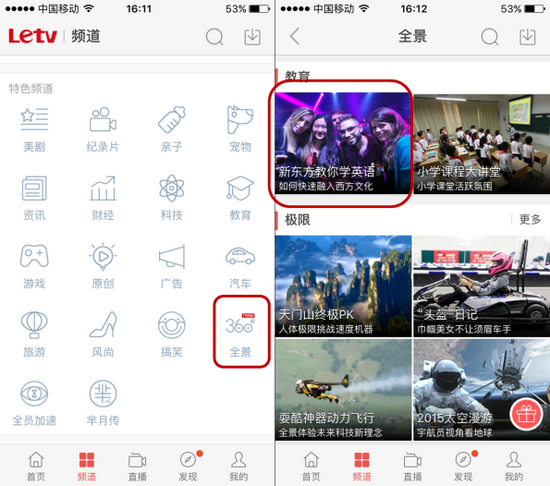 學員佩戴上VR頭盔,在樂視視頻APP上,點擊樂視教育與新東方合作的“360°全景視頻”,然后打開口語課堂視頻,就能進行360°觀看課堂,參與課程進度。