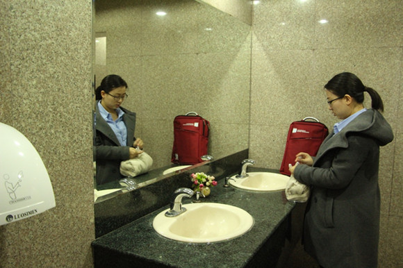 不到4點(diǎn),珊珊已經(jīng)來(lái)到了錄課地點(diǎn),在洗手間,她需要做好出鏡的準(zhǔn)備——換好襯衫,化好妝,然后找錄課室老師報(bào)到。為了出鏡效果,平時(shí)不怎么化妝的珊珊特地買(mǎi)了一個(gè)化妝包和一套化妝工具。