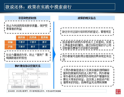 但是要注意的一點,就是我們國家政策相對行業(yè)的發(fā)展存在滯后是非常正常的一件事情,發(fā)現(xiàn)存在這些政策盲點之后,其實也在努力的研究怎樣解決這些政策盲點。2010年的時候就開始探索民辦學(xué)校的分類管理,然后2013年的時候開始修訂相關(guān)的法律,2015年8月份,全國人大常委會通過了教育法律一攬子修正草案,這個相信很多人都有關(guān)注,然后2015年12月27號,全國人大常委會的會議已經(jīng)通過教育法和高等教育法的修改決定。但是當(dāng)時我們都注意到,民辦教育促進(jìn)法的表決暫緩?fù)七t了。我們估計民辦教育的分類管理應(yīng)該是比較確定的,雖然說當(dāng)時推遲了,估計2016年應(yīng)該會把這個法律推出來的,可能是目前現(xiàn)在還有一些爭議沒有解決清楚。