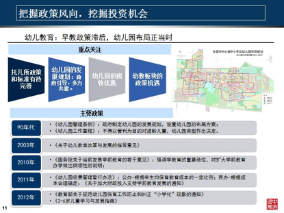 大家看上面這張圖這是一個東營市的幼兒園的規(guī)劃,是他們地方政府出臺的,其實這里我們通過思考可以發(fā)現(xiàn)一個問題,就是地方政府把這些條條框框給它劃出來,哪里放一個幼兒園,哪里放兩個幼兒園。那么其實就說明一個問題,就是幼兒園的布點的數(shù)目和布點的位置可能成為這些連鎖幼教機構(gòu)的核心的競爭力。因為如果說一個機構(gòu)已經(jīng)把這個地區(qū)的主要的優(yōu)質(zhì)地理位置的幼兒園都已經(jīng)布置進(jìn)去了的話,其他的機構(gòu)可能機會就不大了。