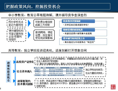 以上是我們教育行業(yè)總體的政策,同時我們還對幼教、中小學(xué)教育,高等教育跟職業(yè)教育幾個細(xì)分領(lǐng)域里面的細(xì)分的教育政策和相關(guān)的投資機會進(jìn)行了一個挖掘。