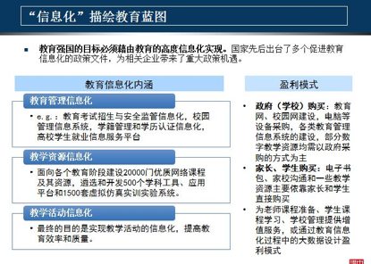 最后一個領(lǐng)域就是教育信息化領(lǐng)域,大家可能更加關(guān)心。我們認(rèn)為教育信息化有三個層次的內(nèi)涵,第一個就是教育管理的信息化,教育管理信息化涉及到很多方面,我舉幾個例子。比如說像教育考試招生和監(jiān)管的信息化,校園管理的信息化,學(xué)籍管理、學(xué)歷教育的信息化、學(xué)生就業(yè)信息服務(wù)的信息化。