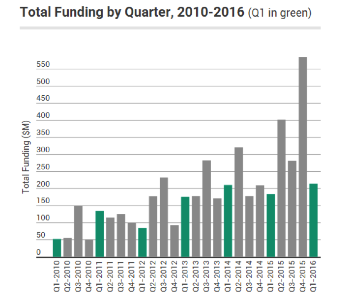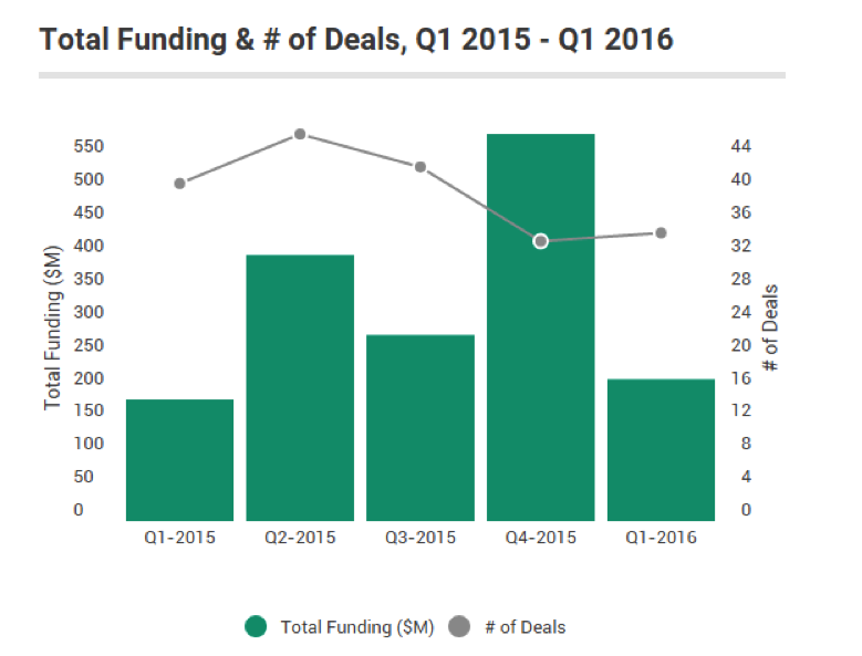 圖表1:2016年第一季度,融資金額從2015年第四季度的5.85億美元下降至2.15億美元。這種下滑看似是災難性的,但是2016年第一季度的交易總金額與2015年第一季度相比,其實出現(xiàn)了同比增長。事實上,2016年第一季度是過去6年來第一季度融資總金額最高的(參見圖表4)。交易總數(shù)量在第一季度保持穩(wěn)定,為35筆(2015年第四季度為34筆)。