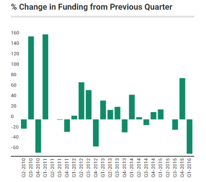 圖表2:盡管如此,2015年第四季度到2016年第一季度的環(huán)比下滑幅度依然是EdSurge自2010年開始追蹤記錄以來最大的。如此之大的融資環(huán)比下滑幅度此前僅出現(xiàn)過兩次,分別是2010年第四季度(-64%)和2012年第四季度(-52%)。在過去24個季度里,融資環(huán)比下滑出現(xiàn)過9次。