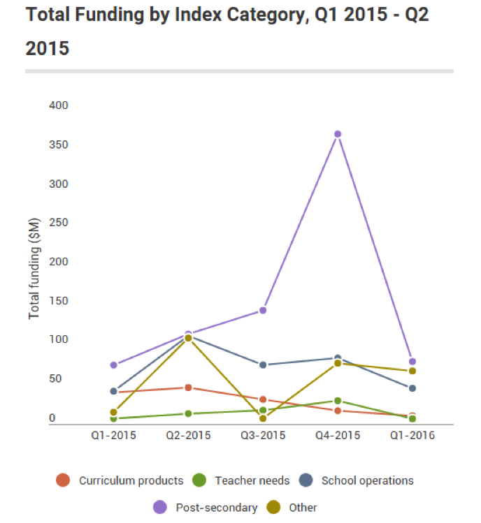 Educated Ventures創(chuàng)始人Christopher Nyren提醒大家不要過度解讀一個季度的數(shù)據(jù)。他認為:“與其他行業(yè)的融資金額相比,教育科技風投融資黯然失色,使得進行季度與季度的對比幾乎毫無統(tǒng)計學意義?!彼€指出,單是Uber一家公司就在2015年獲得了12億美元融資。(根據(jù)EdSurge統(tǒng)計的數(shù)字,美國教育科技初創(chuàng)企業(yè)去年融資總金額為14.5億美元)。