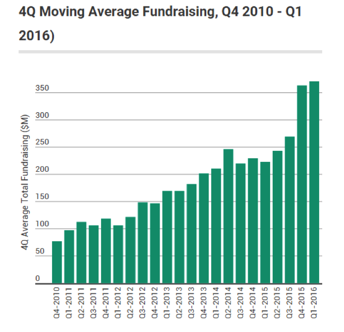 圖表5:正如前文所說的,目前尚未出現(xiàn)恐慌。教育科技投資是一種長線投資,認真投資這一領域的投資者都會明智地宣揚耐心。過去4個季度中教育科技融資總金額的移動平均線表明,該行業(yè)仍在健康發(fā)展,即便在2016年第四季度出現(xiàn)下滑。(在以下圖表中,每一季度的數(shù)據(jù)代表該季度與之前三個季度的平均融資金額。)從這個角度來看,2016年第一季度的融資金額移動平均線有所增長,雖然該季度融資總金額下滑。