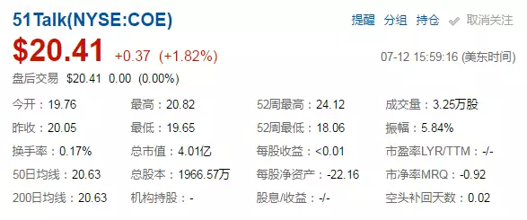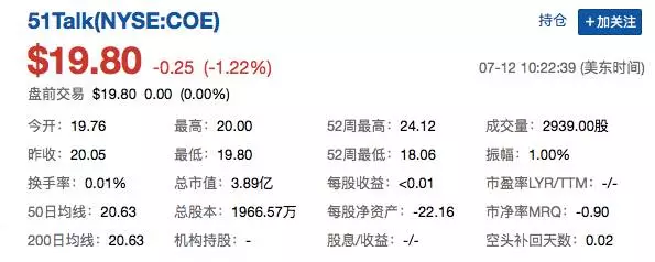 ▲美東時間7月12日10點22分,51Talk股價下跌1.22%