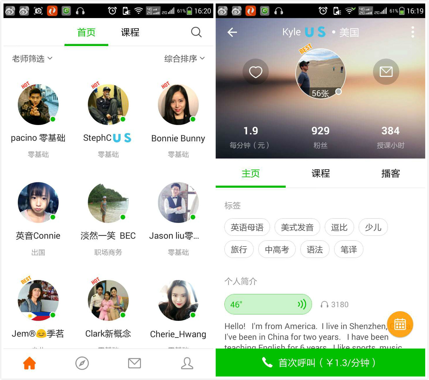 “老師”界面顯示各位老師擅長(zhǎng)的教學(xué)方向。頭像右下角的綠點(diǎn)表示在線,紅點(diǎn)表示占線,灰點(diǎn)則是下線。熱門老師會(huì)有“BEST”或“HOT”標(biāo)記。在老師個(gè)人主頁(yè)下方,可以觀看直播回放和收聽(tīng)其他學(xué)員的一對(duì)一通話錄音。