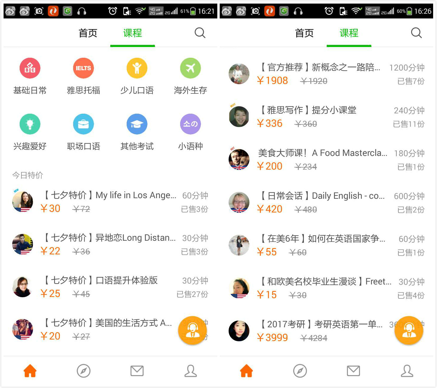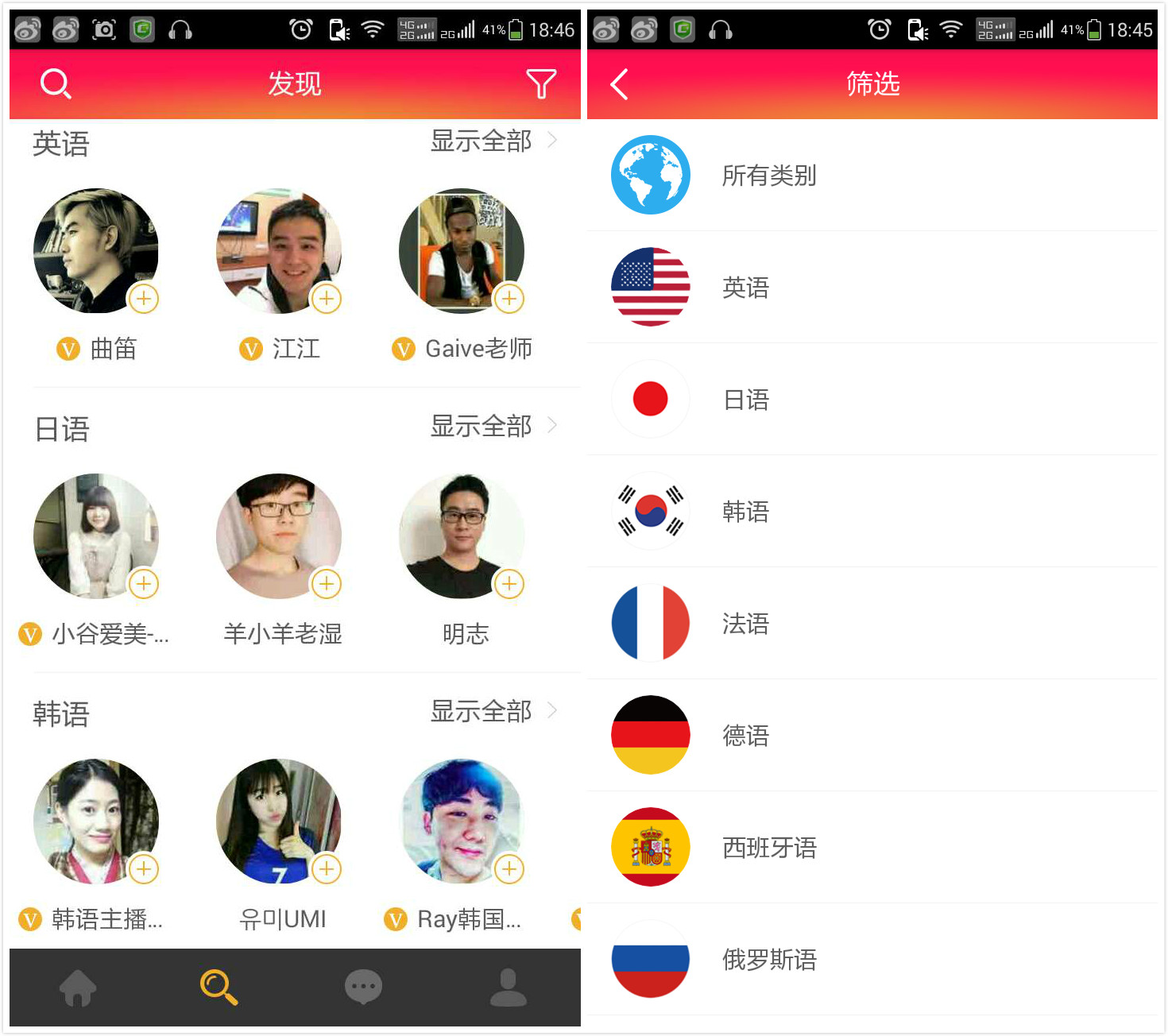 進(jìn)入軟件首頁(yè)就是各語(yǔ)種老師的推薦,有的老師根據(jù)自身的推廣需要通過(guò)了加V認(rèn)證。主要教學(xué)語(yǔ)言包括英語(yǔ)、日語(yǔ)、韓語(yǔ)、德語(yǔ)、法語(yǔ)、俄語(yǔ)、西班牙語(yǔ)、阿拉伯語(yǔ)和國(guó)內(nèi)方言。