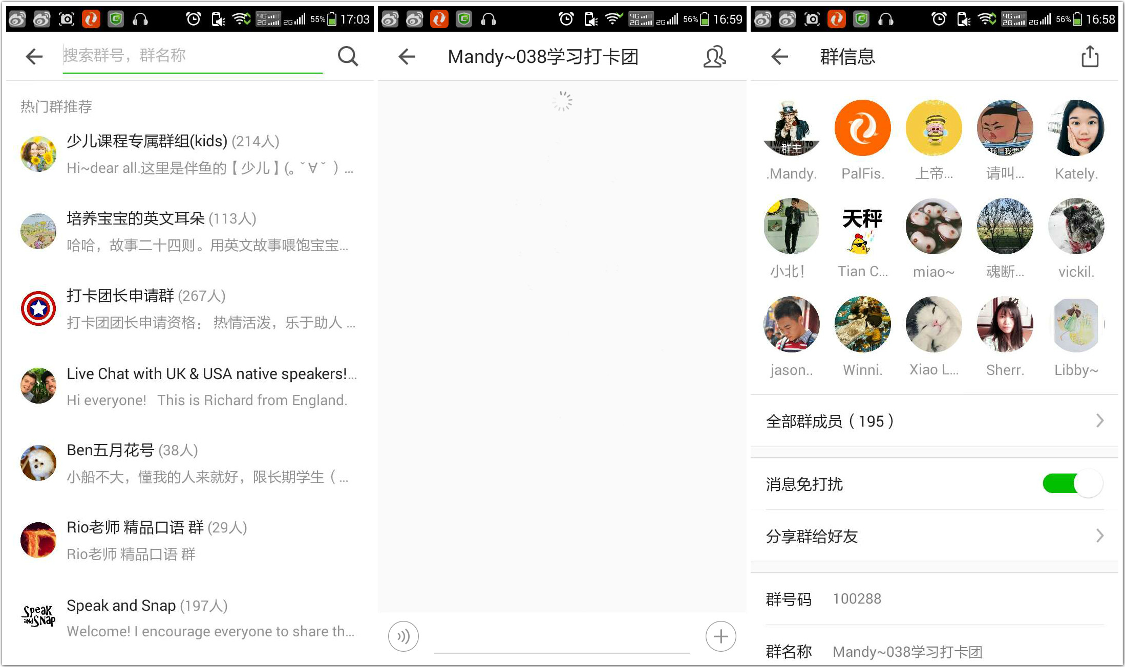 用戶可建立“群組”進(jìn)行互動(dòng)交流,監(jiān)督學(xué)習(xí)打卡。群組界面與微信相似,具有發(fā)送語(yǔ)音和圖片功能。