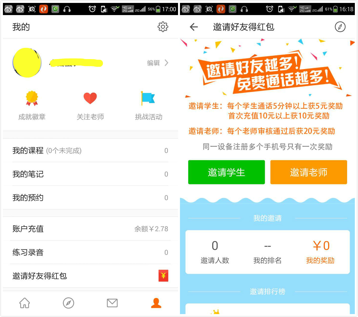 用戶個(gè)人界面顯示已有課程、筆記和賬戶等信息,賬戶可以充值或者通過(guò)邀請(qǐng)好友、打卡、與老師一對(duì)一通話等方式獲得紅包。
