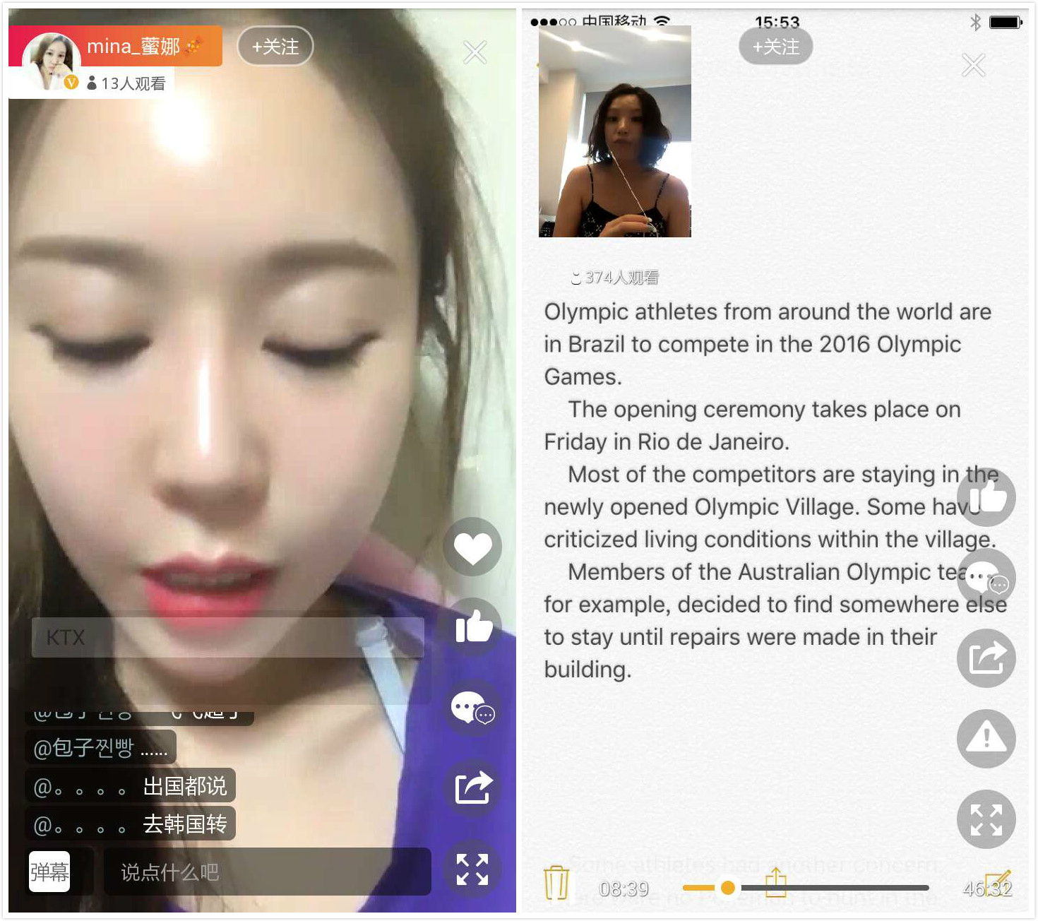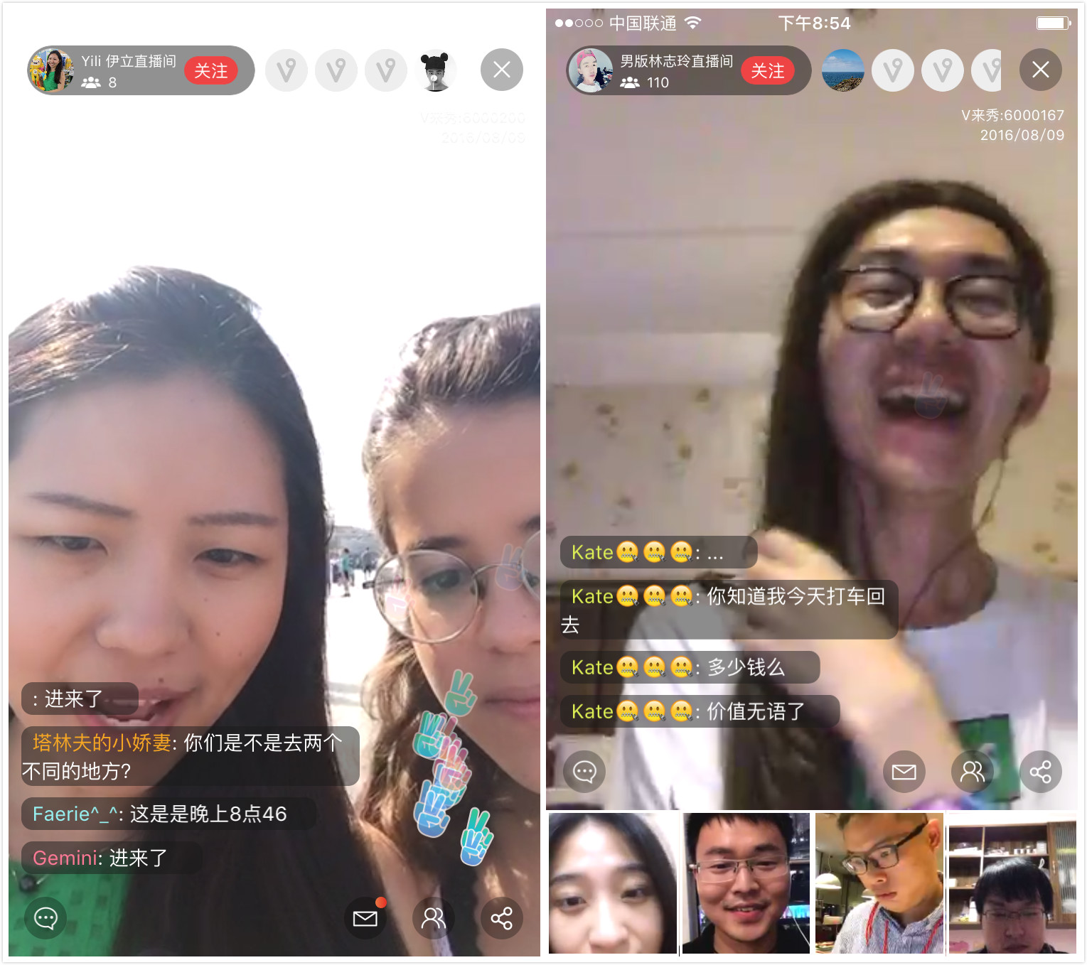 直播界面左上角顯示在線觀看人數(shù)和主播個(gè)人介紹入口。用戶在直播現(xiàn)場(chǎng)可以發(fā)起評(píng)論與主播互動(dòng),甚至直接與主播視頻連線。一場(chǎng)直播最多容納四位用戶同時(shí)連線,整個(gè)連線過(guò)程其他用戶可以觀看并參與文字互動(dòng)。