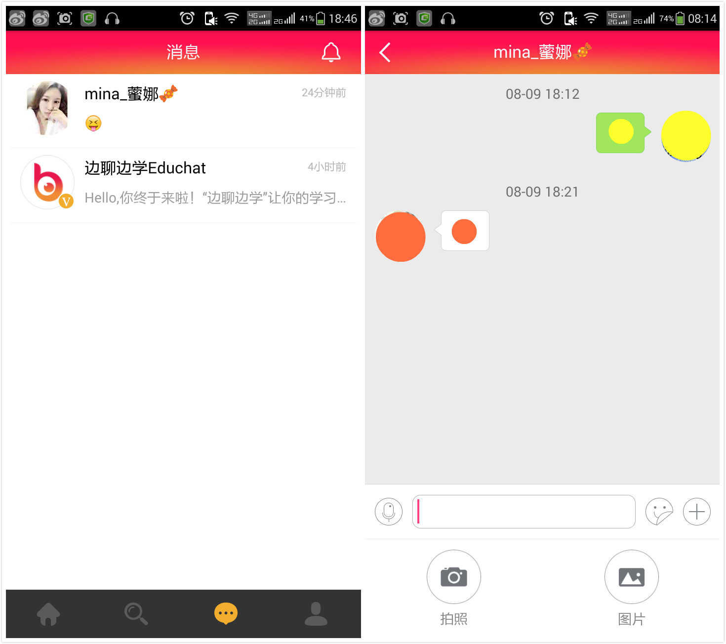 在“消息”欄目,用戶可以和其他同學(xué)或老師互動(dòng)交流。消息界面具有發(fā)送語(yǔ)音、圖片和表情功能。