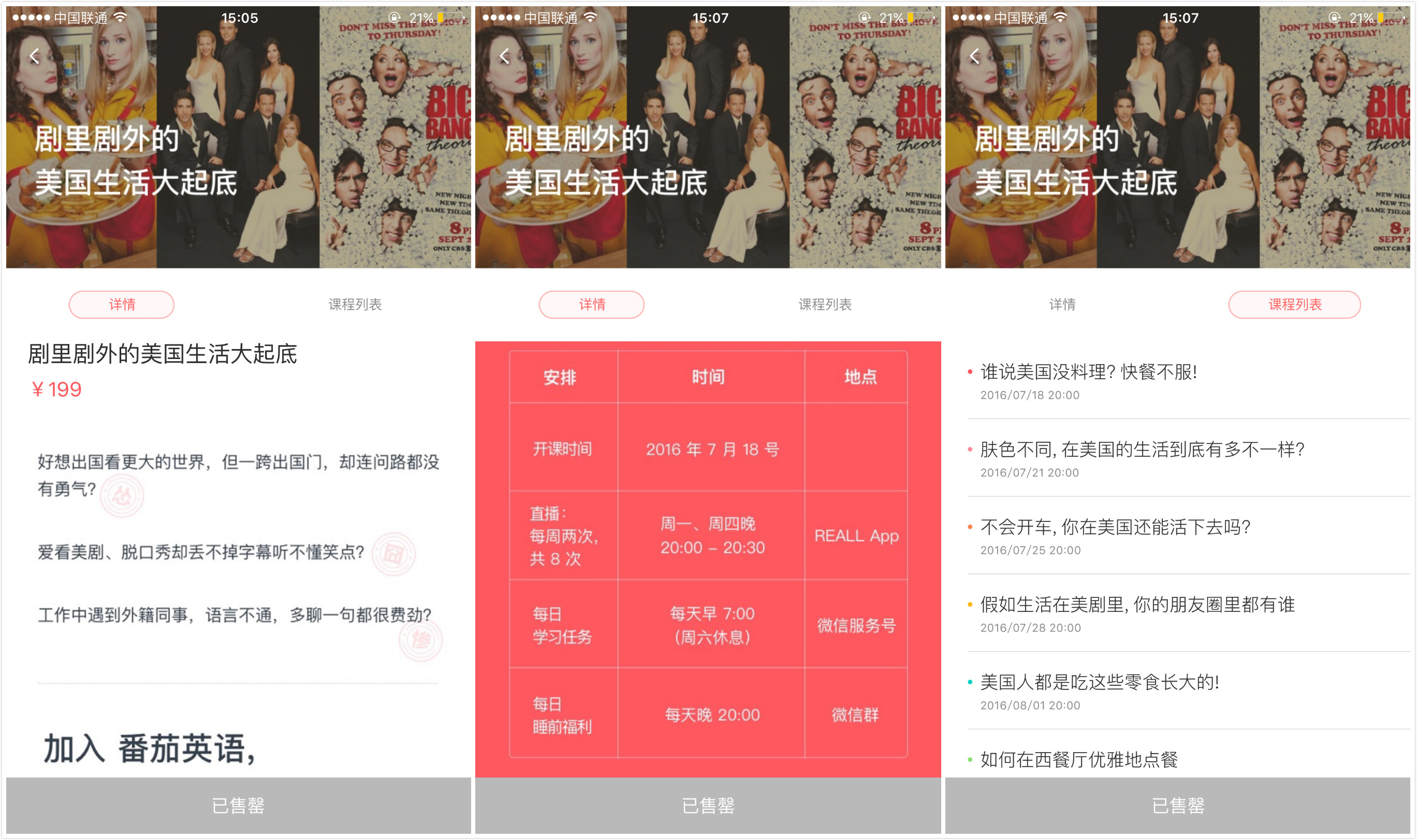 截至目前筆者登錄番茄英語(yǔ)賬號(hào)時(shí),在售課程僅有“劇里劇外的美國(guó)生活大起底”一門,共8節(jié)課,且已售罄;
