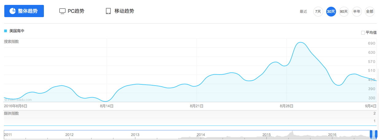 (圖為百度指數(shù)中“美國(guó)高中”搜索量變化趨勢(shì))