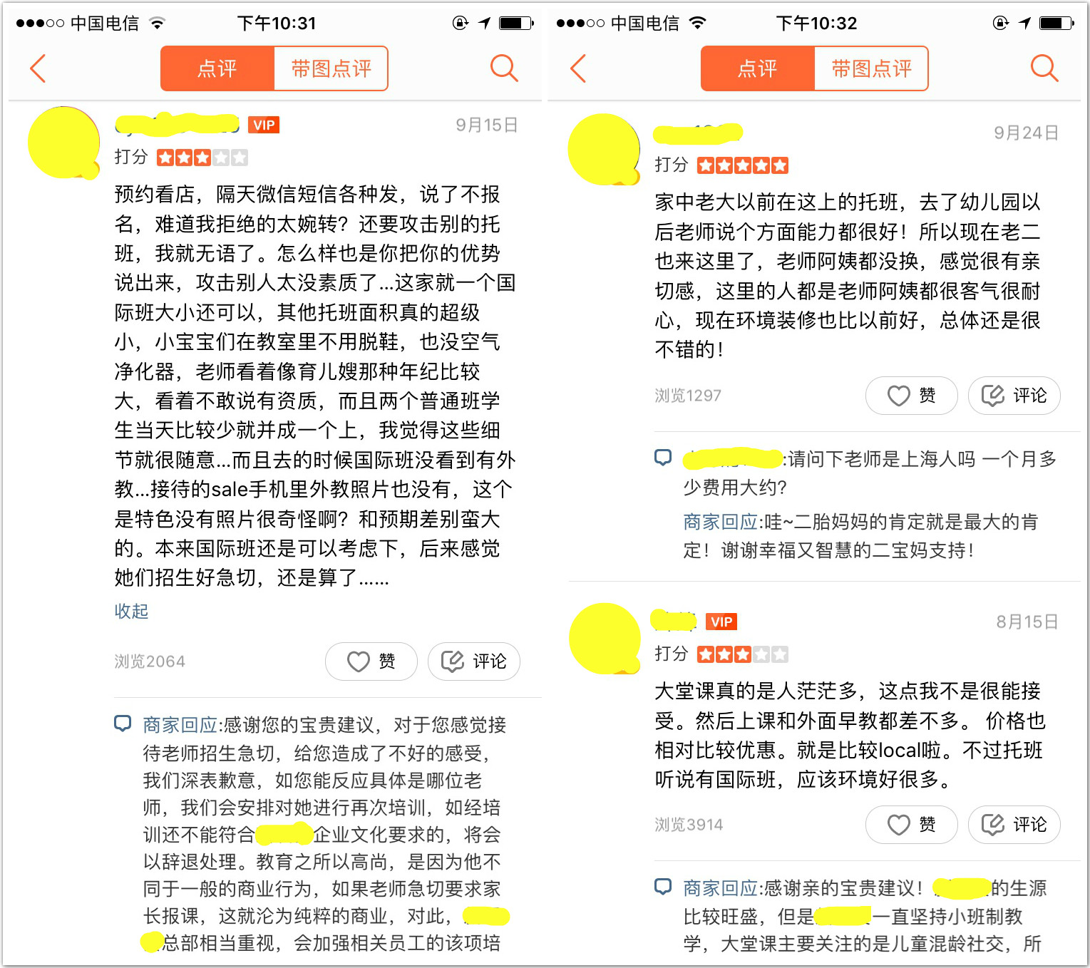 (上海某家入駐了四年的早教機(jī)構(gòu)近期用戶評(píng)論及商家回應(yīng))