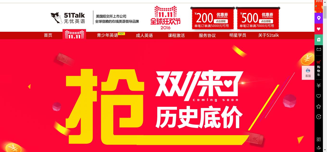 51Talk在天貓的旗艦店打出“歷史底價”吸睛。從11月1日起,51Talk就開始為雙十一預(yù)熱了。1日到8日,51Talk推出“1元秒殺”價值99元的成人和青少年外教體驗(yàn)課,及原價480元外教口語集訓(xùn)課的1折優(yōu)惠。9日到11日,51Talk幾項成人課程開展限時特價,降價幅度從100到2400元不等。多個次卡課程包同步優(yōu)惠,51Talk的這次雙十一展示了足夠的誠意。