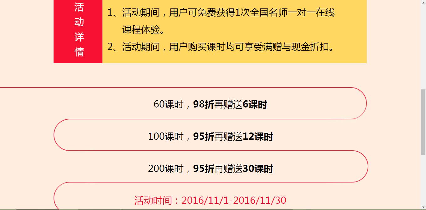 打折又送課,而且活動時間持續(xù)整個11月,100教育也是挺拼的。這是要在力度和長度上雙管齊下的節(jié)奏啊。