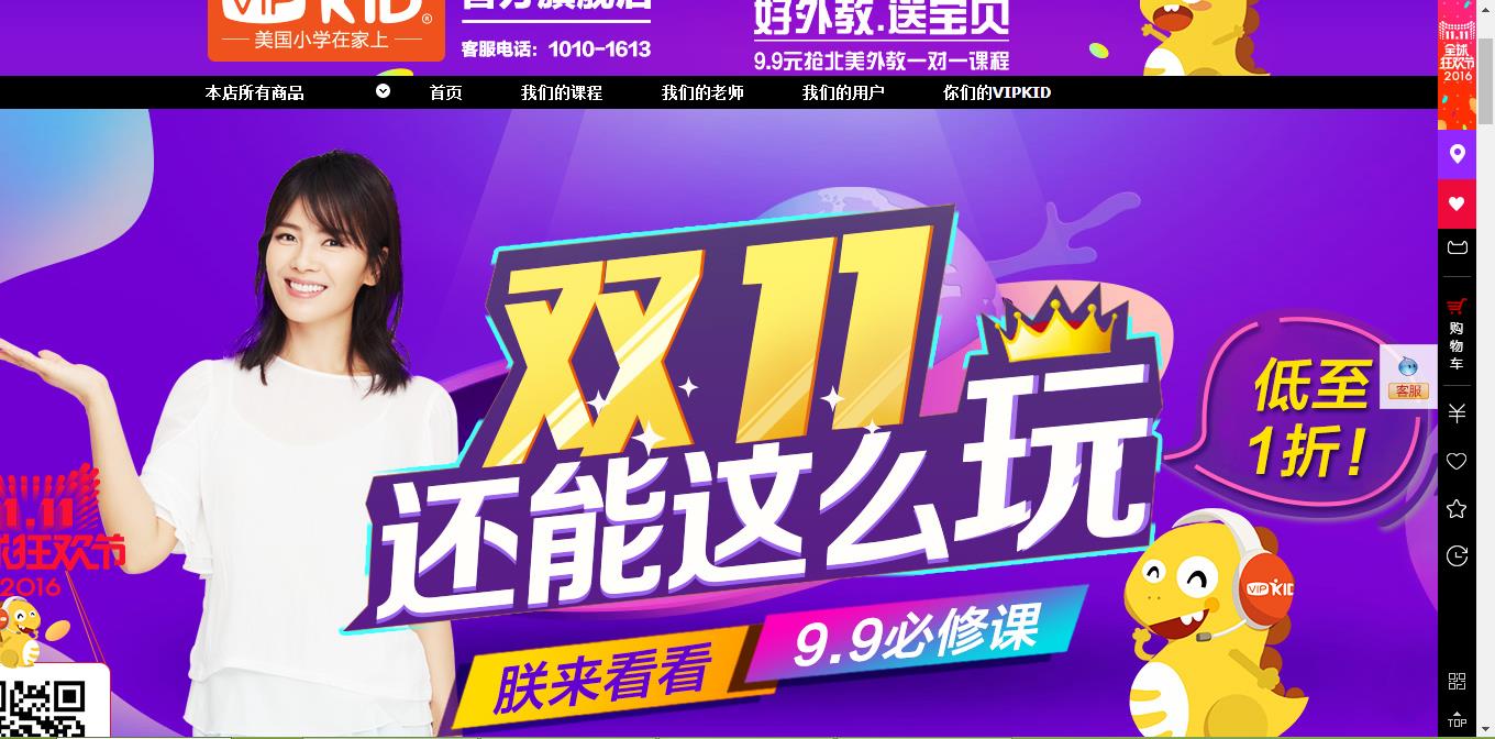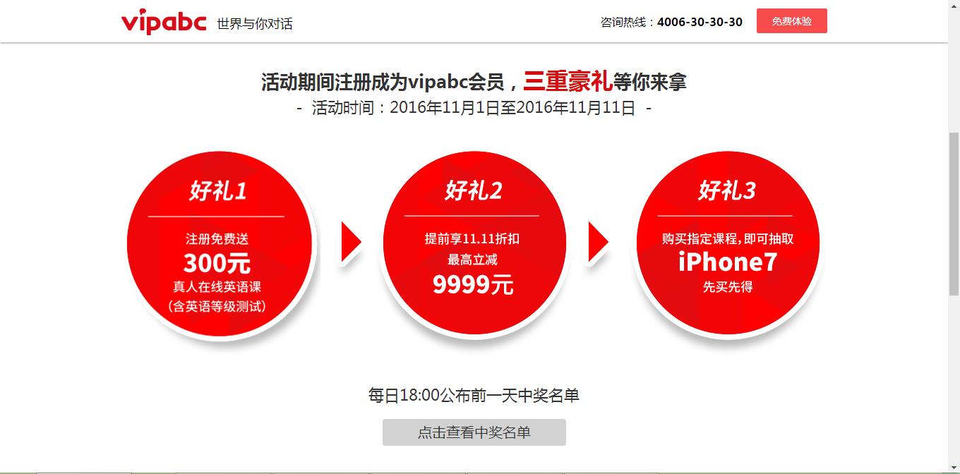 vipabc除了在官網(wǎng)上賣力吆喝雙十一活動,在天貓和京東的旗艦店也同步促銷。除了常規(guī)的打折和立減之外,vipabc促銷界面顯示,購買一年級以上產(chǎn)品的客戶在雙十一當(dāng)天交易,還有機(jī)會獲得限量禮品iPhone7,也是賺足了眼球。
