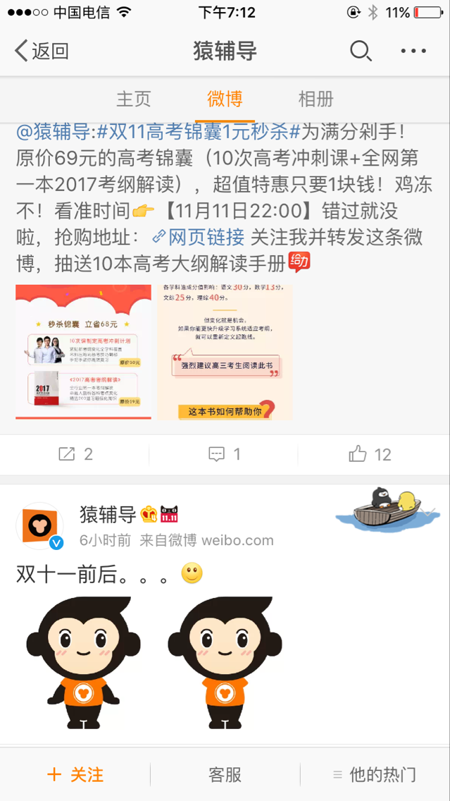 猿輔導(dǎo)推出了1元秒殺原價69元的高考錦囊,內(nèi)含10次課程和2017年考綱解讀,雙十一當(dāng)天22:00開始搶購。