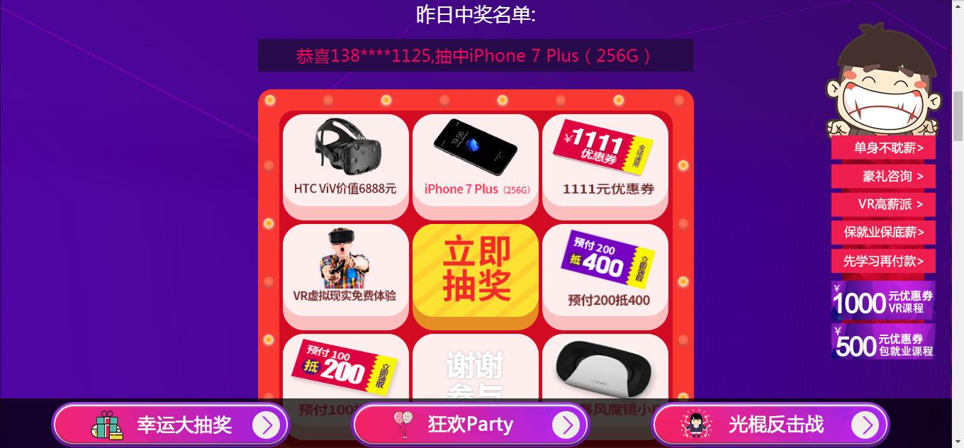 我贏職場玩的是抽獎送禮,從11月5日至30日,用戶通過抽獎可獲得iPhone7、HTC Vive、暴風(fēng)魔鏡小D、1111元課程優(yōu)惠券等?,F(xiàn)在搞個活動,腎7已然成了硬通貨。
