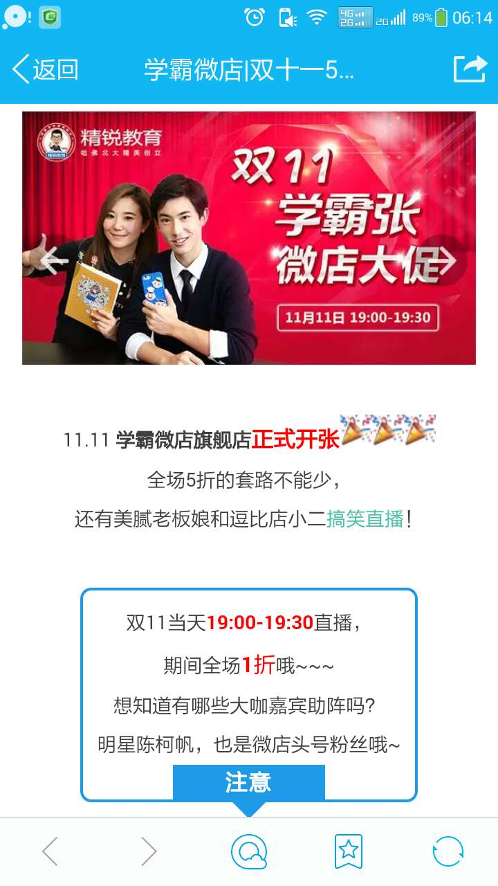 精銳教育的學(xué)霸微店選在了雙十一開張,打折賣周邊,產(chǎn)品包括精銳創(chuàng)始人兼CEO真人故事改編漫畫、二次元形象的手機(jī)殼和各種文具。另外,精銳派出和范冰冰在《武媚娘傳奇》里演過對手戲的小鮮肉陳柯帆來當(dāng)?shù)晷《?,在雙十一19:00到19:30直播售賣,直戳迷妹少女心。