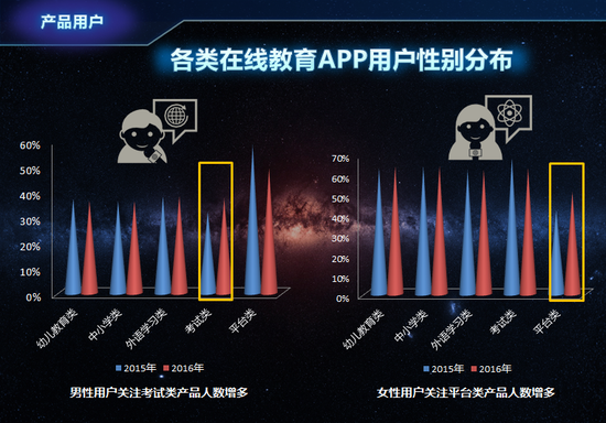 與2015年相比,男性關(guān)注考試類產(chǎn)品人數(shù)增至37%,增長(zhǎng)5%;女性關(guān)注平臺(tái)類產(chǎn)品人數(shù)增至51%,增長(zhǎng)9%。