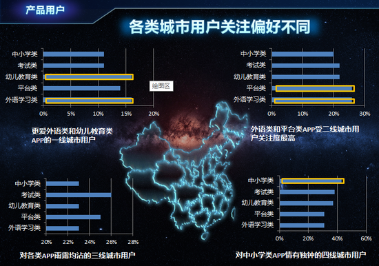 一線城市關(guān)注幼兒教育和外語(yǔ)學(xué)習(xí)的用戶較多,占比32%;四線城市則關(guān)注中小學(xué)類產(chǎn)品,占比43%。