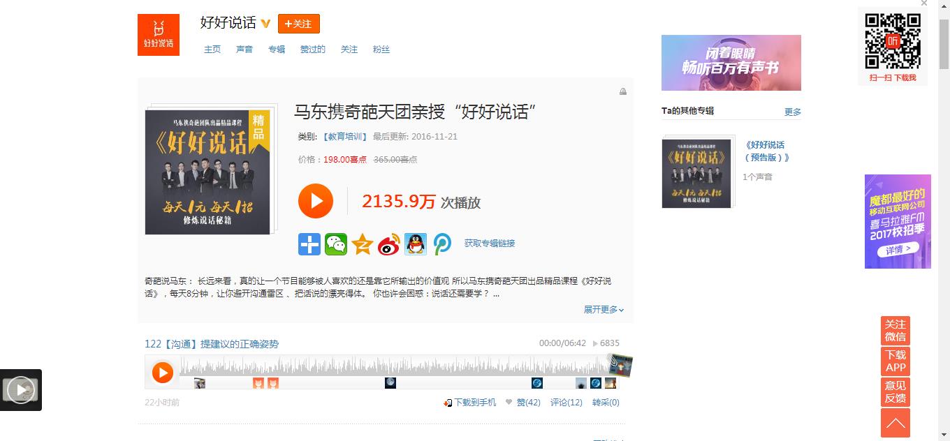 《好好說話》目前已更新122集,預(yù)計更新260集,整套課程售價198元。目前在喜馬拉雅FM評分4.6分,播放2135.9萬次。